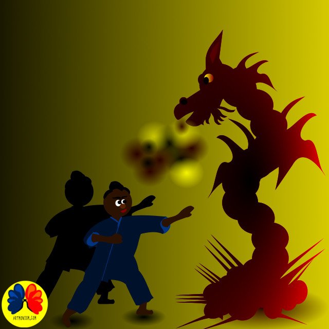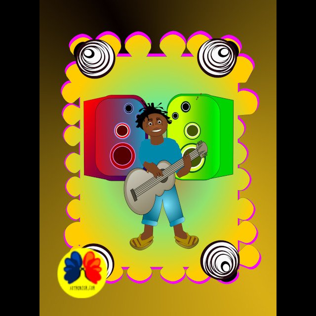 “Hi Folks” A colorful abstract character floats against a warm golden background, surrounded by white feather-like shapes. The figure has wide expressive eyes, a red bowtie, patterned green clothing, and mismatched feet, rendered in a playful, dreamlike graphic style