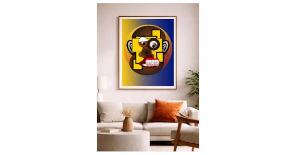 Contemporary digital illustration by Serj Éty’n displayed as wall art in a modern interior, featuring vibrant colors, abstract shapes, and expressive character design, enhancing home decor with bold artistic energy.